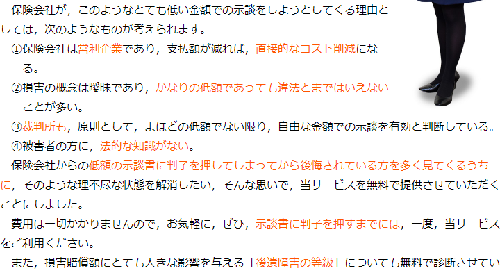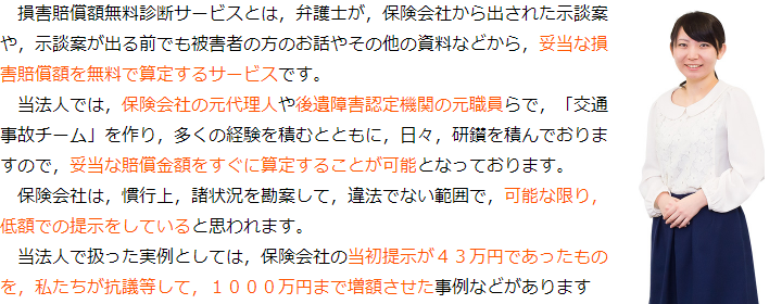当法人では、少しでも多くの方が適切な賠償金を獲得することができるよう、賠償金額を算定するサービスを行っております。